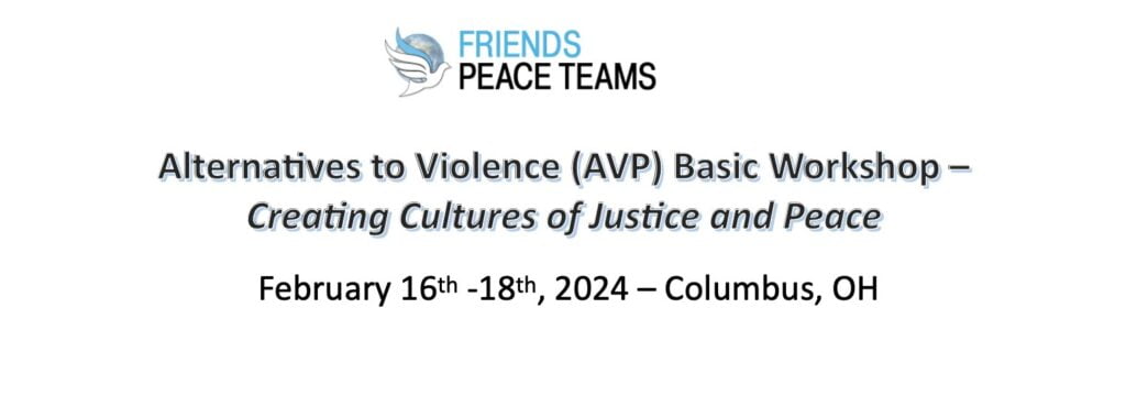 This workshop, open to Friends throughout LEYM, builds community and skills for personal practice and change that we need to stand up to violence in ourselves and others and to create just, peaceful homes and communities. Get the promotional flyer here. SAVE THE DATE: Weekend of February 16th -18th, 2024 – 18 hoursProgram Sessions:Friday Feb … Continue reading Alternatives to Violence (AVP) Basic Workshop Upcoming Feb 16-18 in Columbus, OH